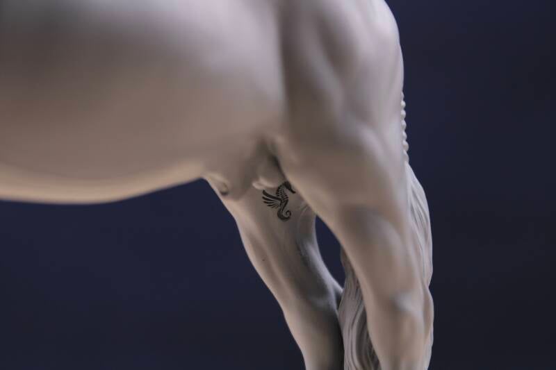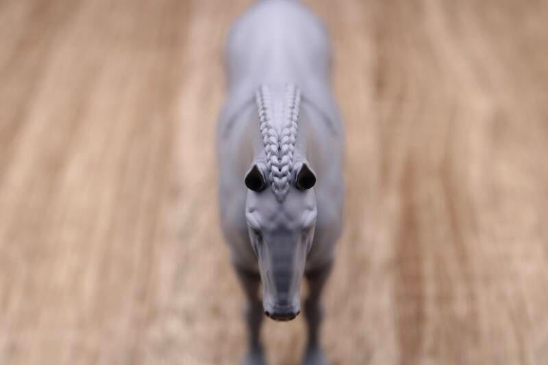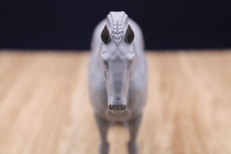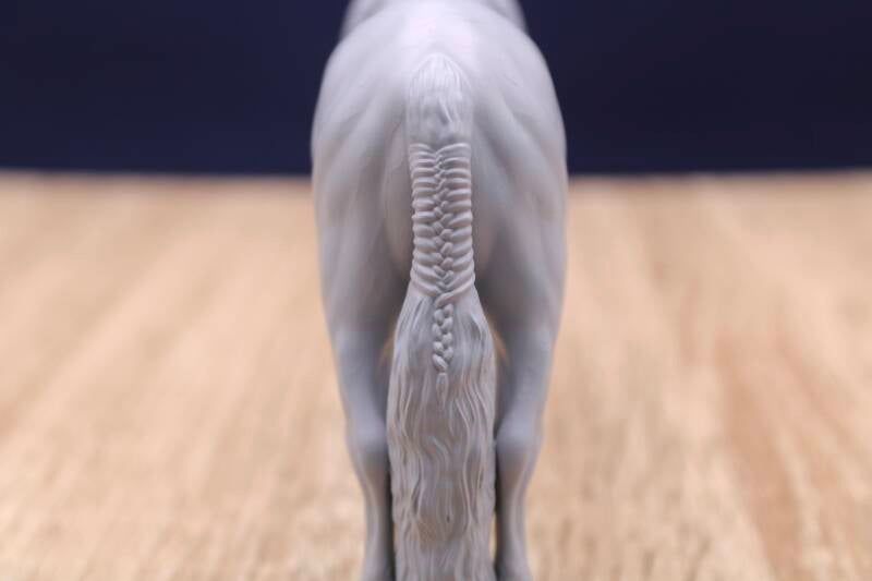 This majestic Friesian stallion with his a braided mane and tail is just waiting to be painted. With his large head carriage, he is perfectly suited to be harnessed.