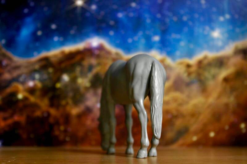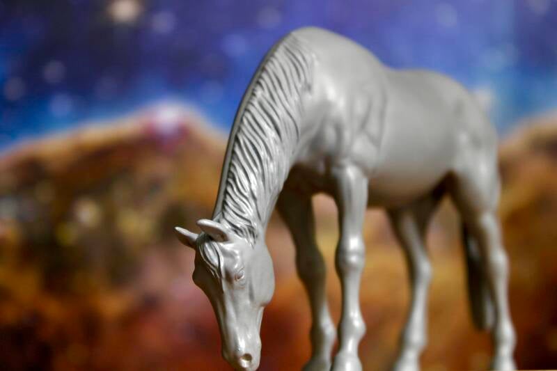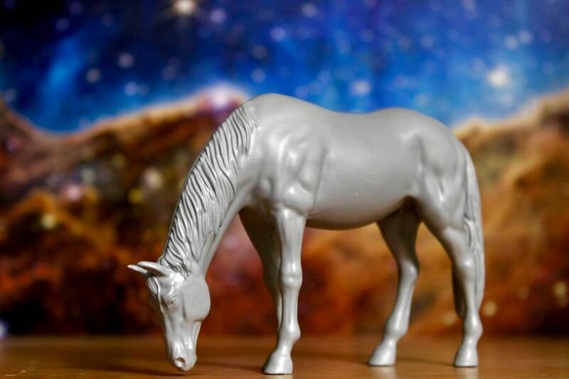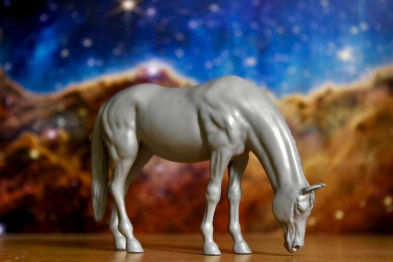 This peaceful stallion is relaxing while grazing. He is calmly standing and eating. You can imagine him in the meadow, in freedom or in the box.